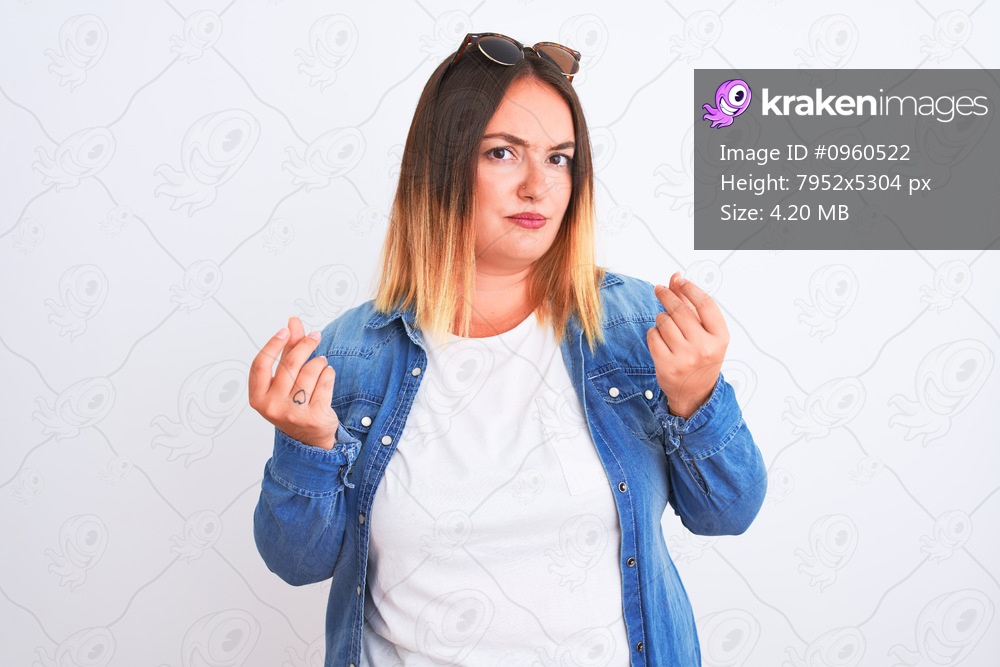 Beautiful woman wearing denim shirt standing over isolated white background doing money gesture with hands, asking for salary payment, millionaire business - Kraken Images