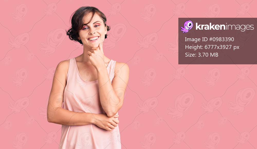 Beautiful young woman with short hair wearing casual style with sleeveless shirt looking confident at the camera with smile with crossed arms and hand raised on chin. thinking positive. - Kraken Images