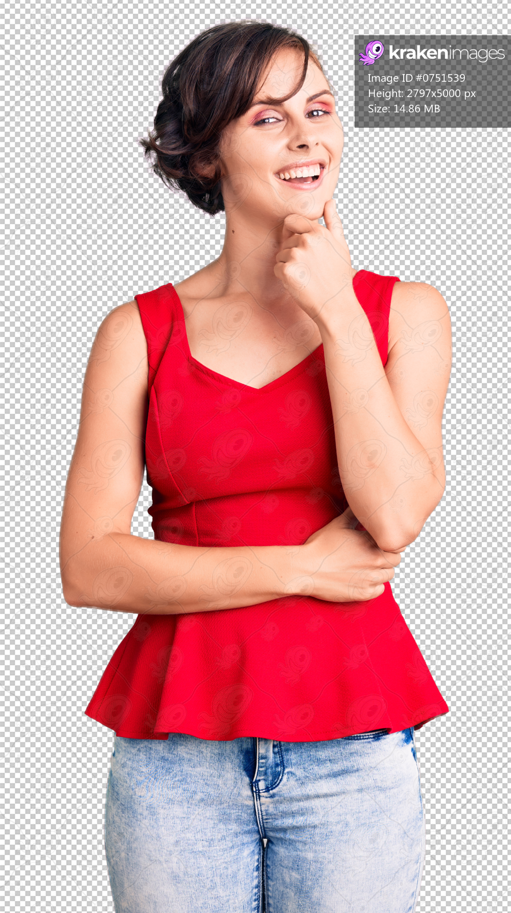 Beautiful young woman with short hair wearing casual style with sleeveless shirt looking confident at the camera smiling with crossed arms and hand raised on chin. thinking positive. - Kraken Images