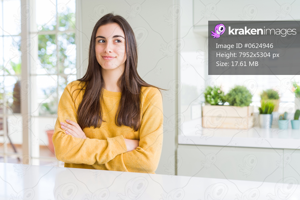 Beautiful young woman wearing yellow sweater smiling looking side and staring away thinking.