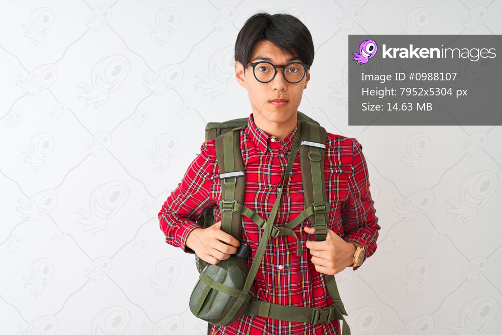 Chinese hiker man wearing backpack canteen glasses over isolated white background Relaxed with serious expression on face. Simple and natural looking at the camera. - Kraken Images