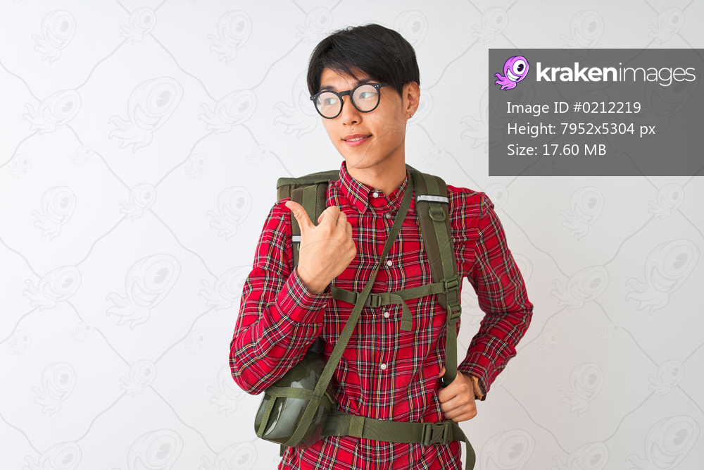 Chinese hiker man wearing backpack canteen glasses over isolated white background smiling with happy face looking and pointing to the side with thumb up. - Kraken Images