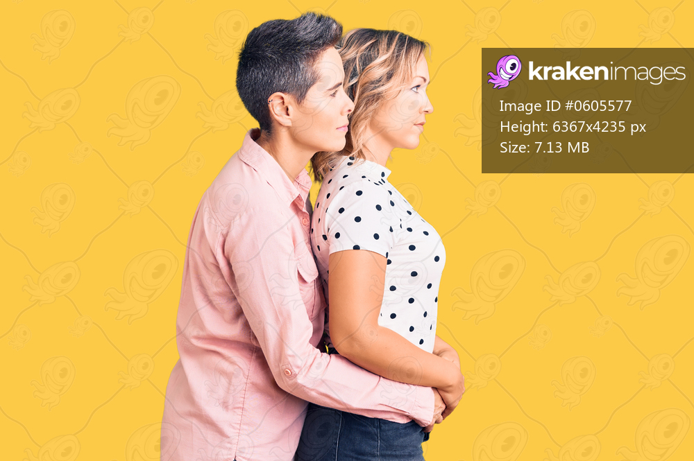 Couple of women wearing casual clothes looking to side, relax profile pose with natural face with confident smile.