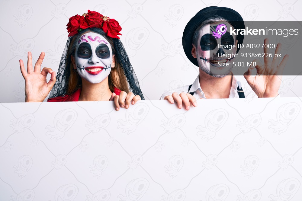 Couple wearing day of the dead costume holding blank empty banner doing ok sign with fingers, smiling friendly gesturing excellent symbol