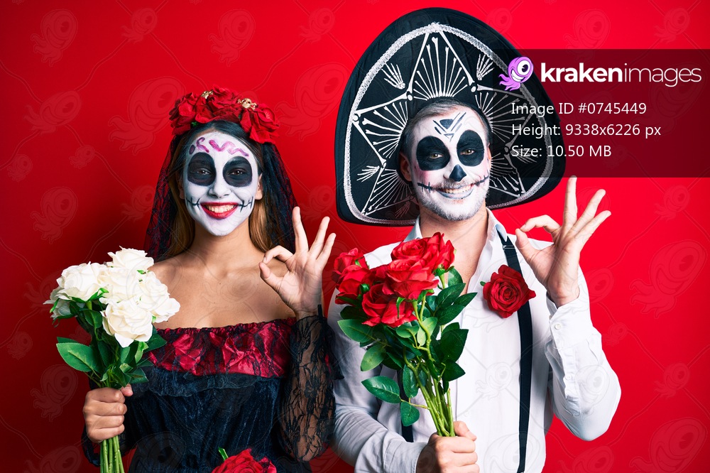 Couple wearing day of the dead costume holding flowers doing ok sign with fingers, smiling friendly gesturing excellent symbol