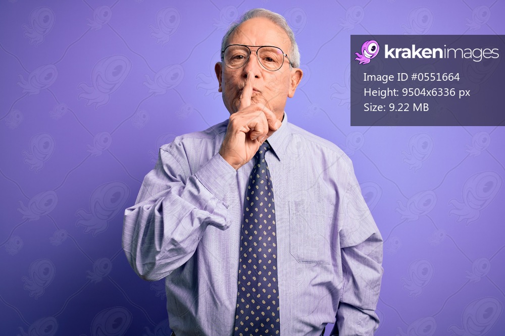 Grey haired senior business man wearing glasses standing over purple isolated background asking to be quiet with finger on lips. Silence and secret concept. - Kraken Images