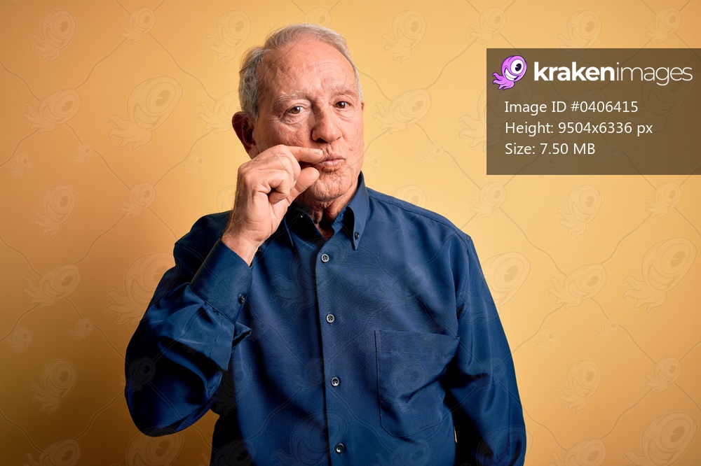 Grey haired senior man wearing casual blue shirt standing over yellow background mouth and lips shut as zip with fingers. Secret and silent, taboo talking - Kraken Images