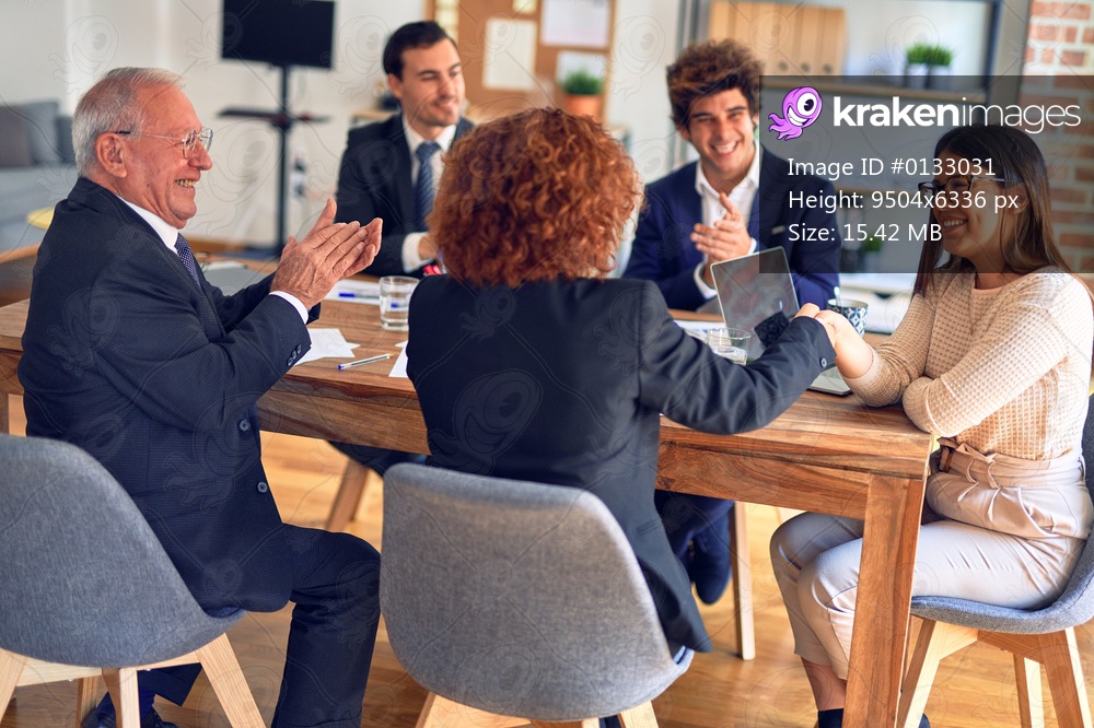 Group of business workers smiling happy and confident in a meeting. Speaking with smile on face working together shaking hands for agreement at the office.