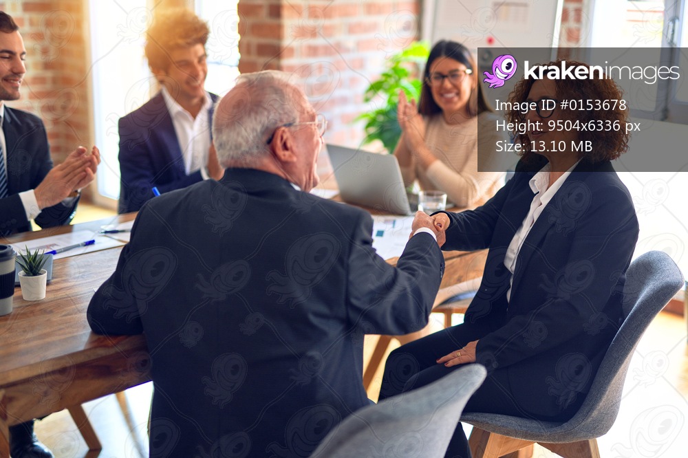 Group of business workers smiling happy and confident in a meeting. Speaking with smile on face working together shaking hands for agreement at the office. - Kraken Images
