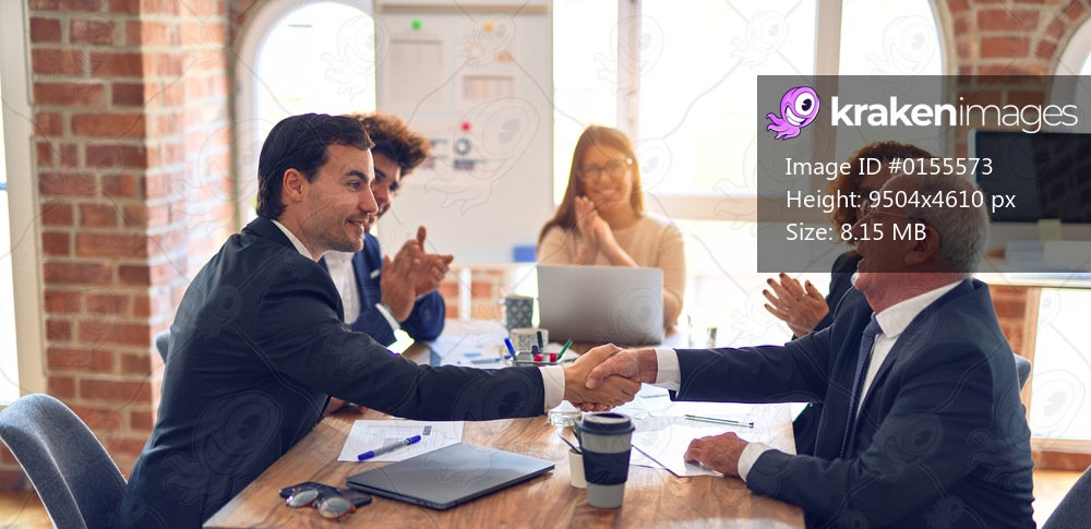 Group of business workers smiling happy and confident in a meeting. Speaking with smile on face working together shaking hands for agreement at the office. - Kraken Images