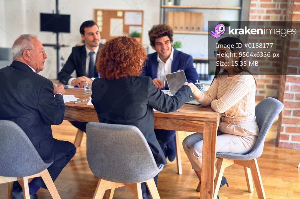 Group of business workers smiling happy and confident in a meeting. Speaking with smile on face working together shaking hands for agreement at the office. - Kraken Images