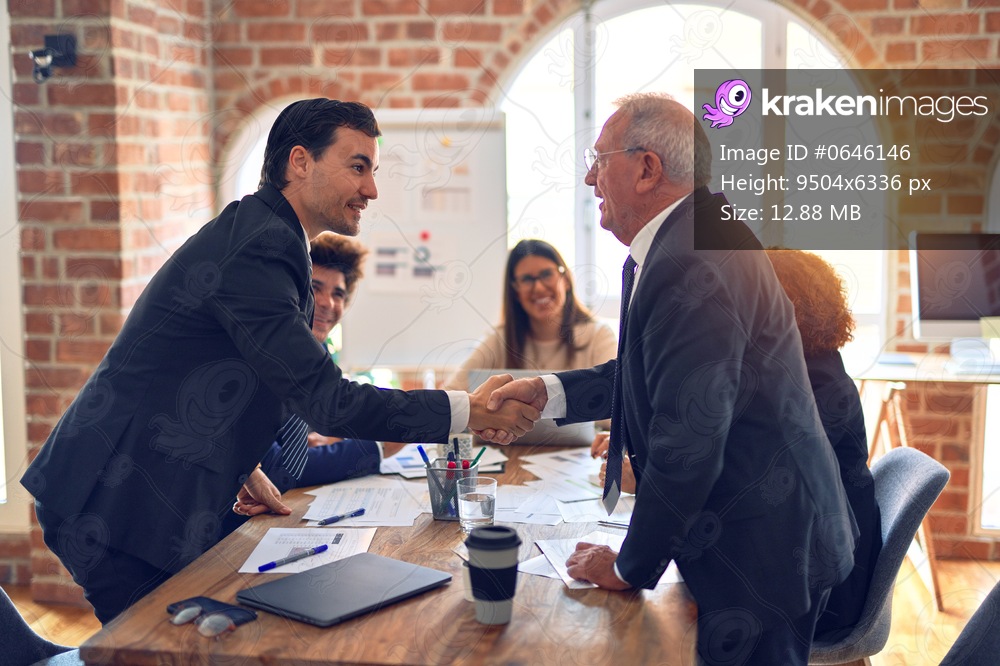 Group of business workers smiling happy and confident in a meeting. Speaking with smile on face working together shaking hands for agreement at the office. - Kraken Images