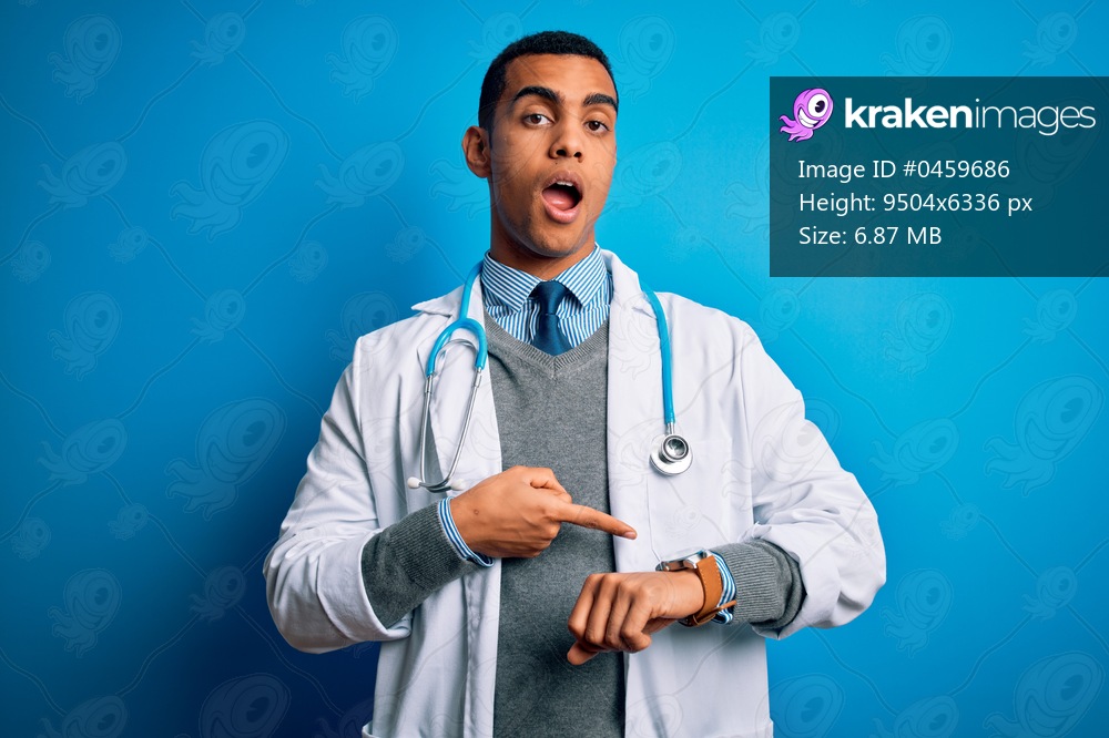 Handsome african american doctor man wearing coat and stethoscope over blue background In hurry pointing to watch time, impatience, upset and angry for deadline delay - Kraken Images