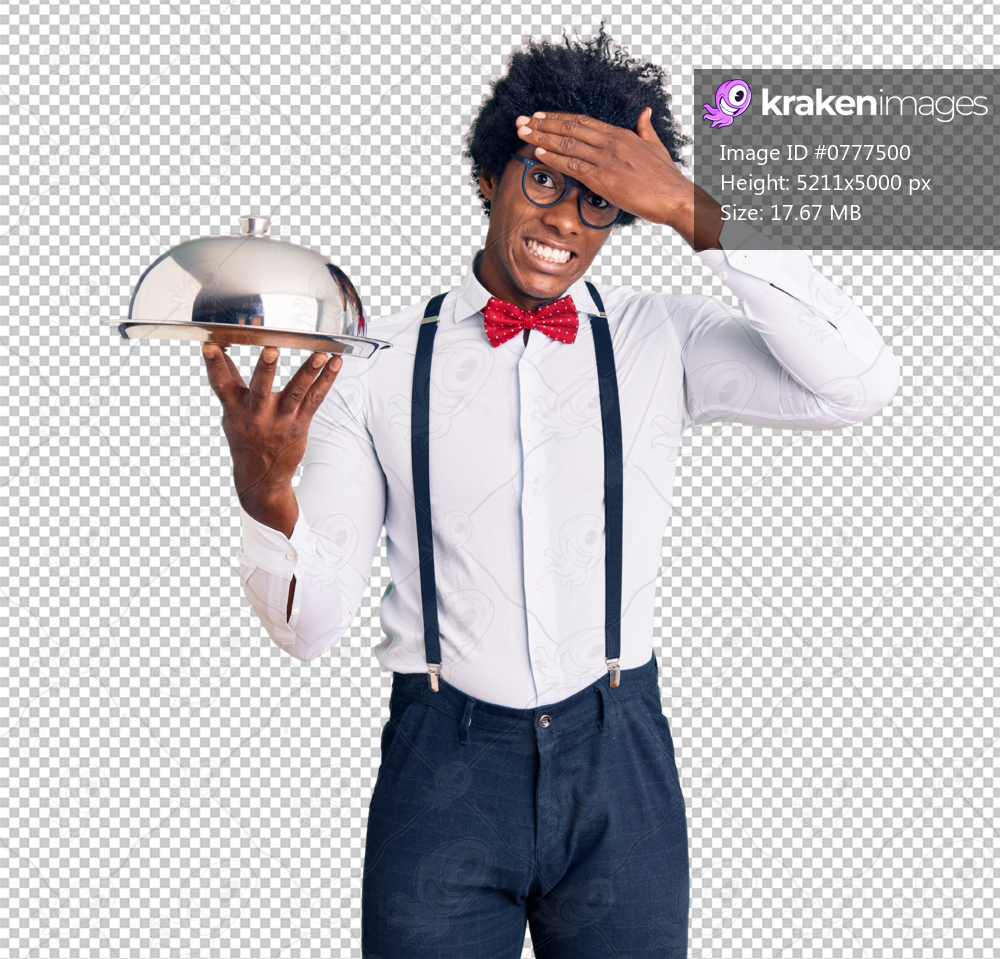 Handsome african american man with afro hair wearing waiter uniform holding silver tray stressed and frustrated with hand on head, surprised and angry face - Kraken Images