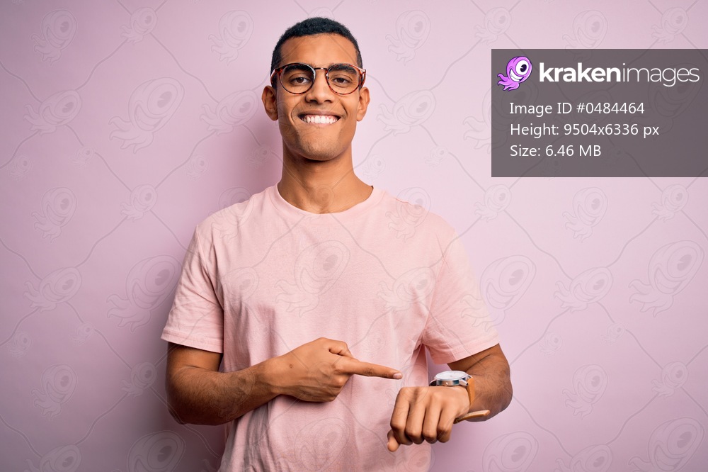 Handsome african american man wearing casual t-shirt and glasses over pink background In hurry pointing to watch time, impatience, upset and angry for deadline delay - Kraken Images