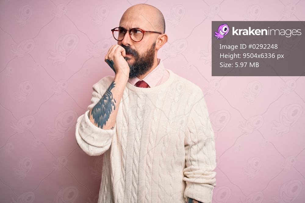 Handsome bald man with beard and tattoo wearing glasses and sweater over pink background looking stressed and nervous with hands on mouth biting nails. Anxiety problem. - Kraken Images