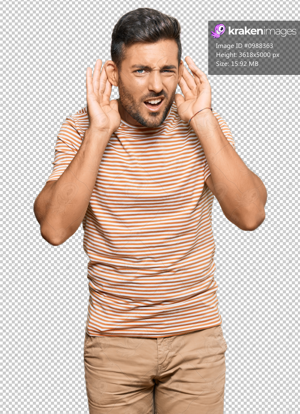 Handsome hispanic man wearing casual clothes trying to hear both hands on ear gesture, curious for gossip. hearing problem, deaf