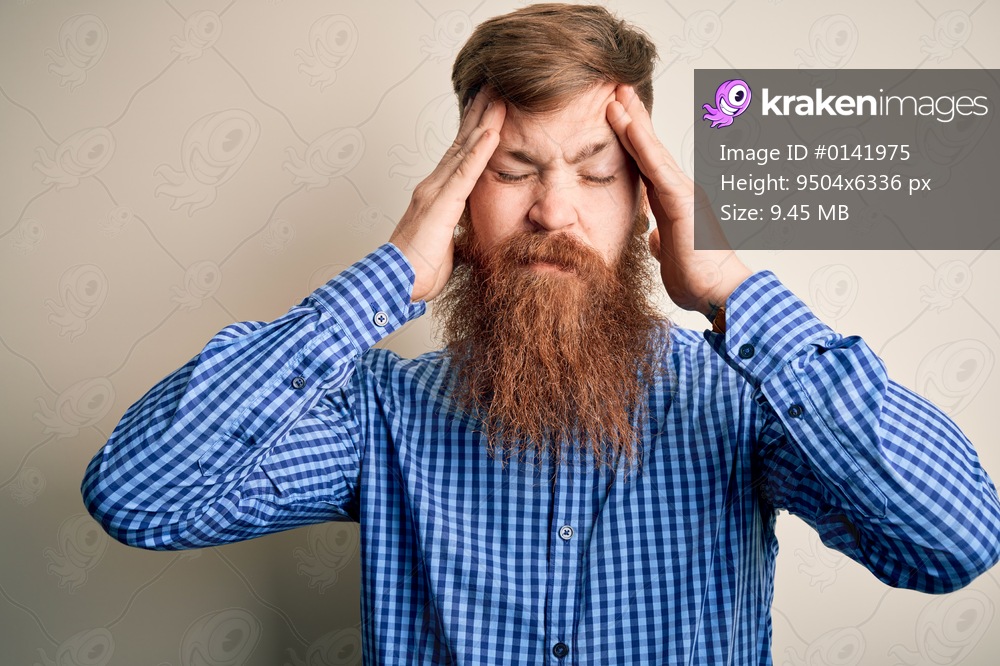 Handsome Irish redhead business man with beard standing over isolated background suffering from headache desperate and stressed because pain and migraine. Hands on head. - Kraken Images