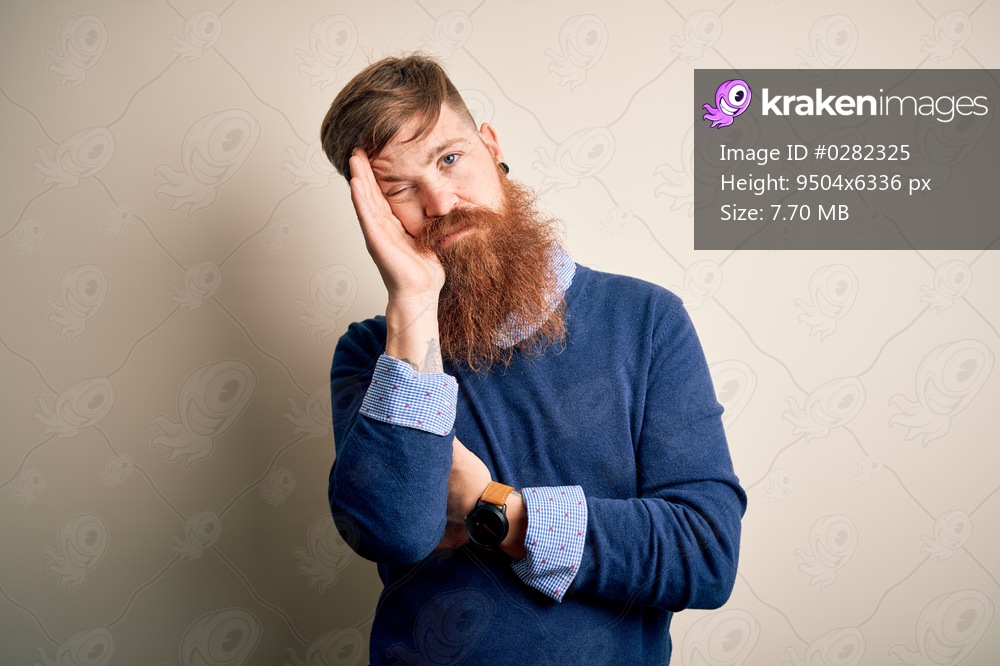 Handsome Irish redhead business man with beard standing over isolated background thinking looking tired and bored with depression problems with crossed arms. - Kraken Images