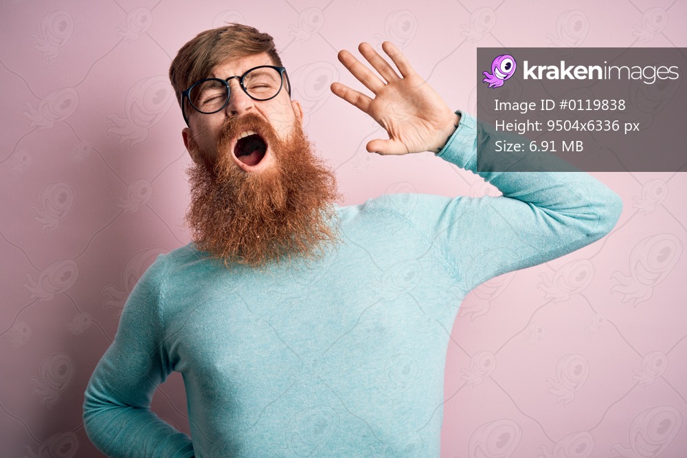 Handsome Irish redhead man with beard wearing glasses over pink isolated background stretching back, tired and relaxed, sleepy and yawning for early morning - Kraken Images