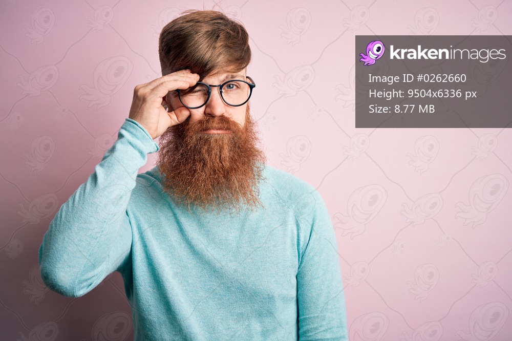 Handsome Irish redhead man with beard wearing glasses over pink isolated background worried and stressed about a problem with hand on forehead, nervous and anxious for crisis - Kraken Images