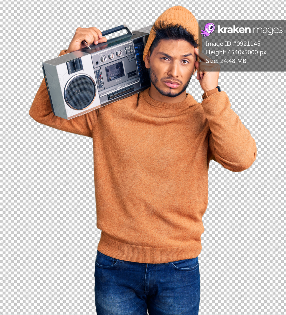 Handsome latin american young man holding boombox, listening to music worried and stressed about a problem with hand on forehead, nervous and anxious for crisis - Kraken Images