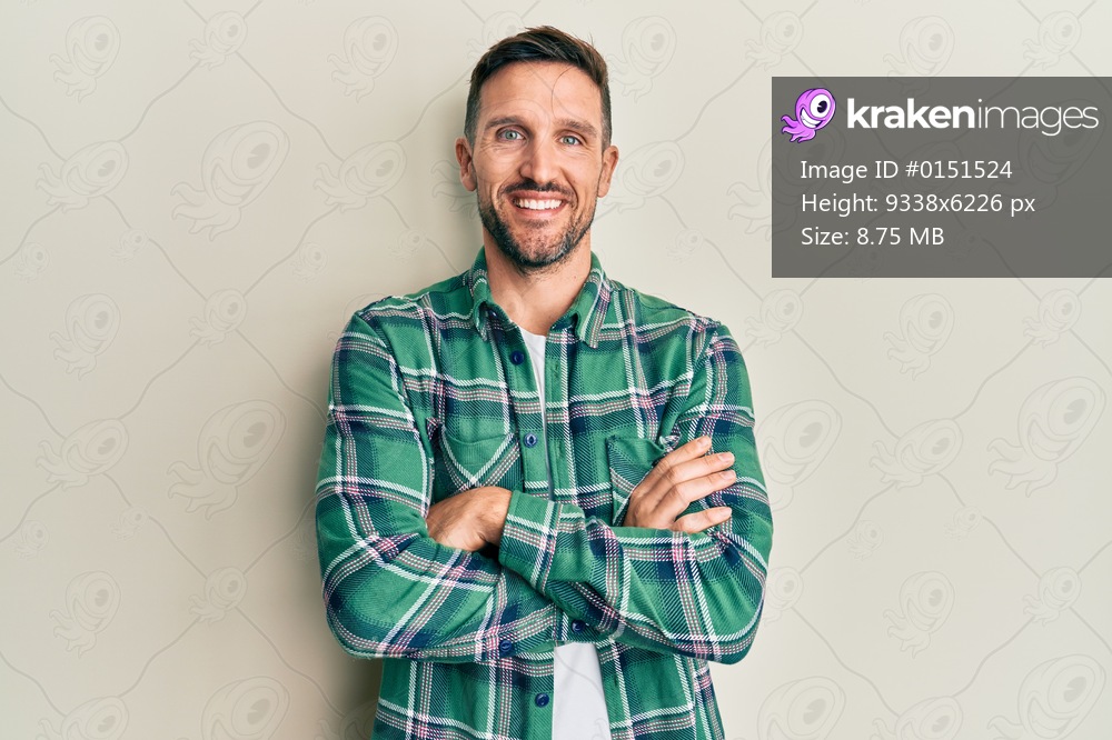 Handsome man with beard wearing casual clothes happy face smiling with crossed arms looking at the camera. positive person.