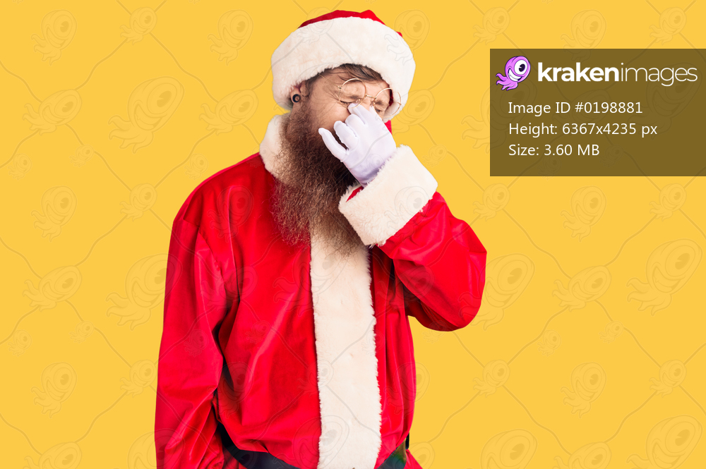 Handsome young red head man with long beard wearing santa claus costume tired rubbing nose and eyes feeling fatigue and headache. stress and frustration concept. - Kraken Images