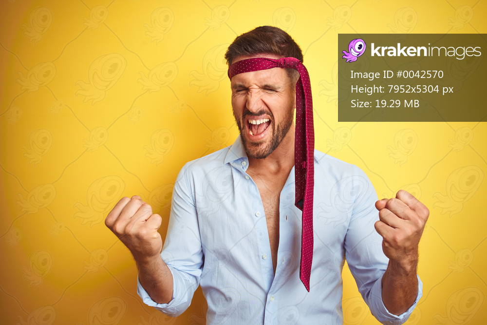 Hangover business man drunk and crazy for hangover wearing tie on head very happy and excited doing winner gesture with arms raised, smiling and screaming for success. Celebration concept. - Kraken Images