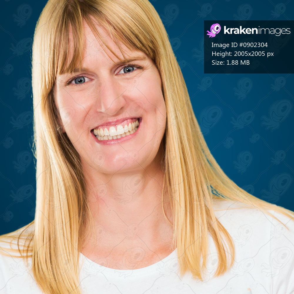 happy woman smilig against a blue background