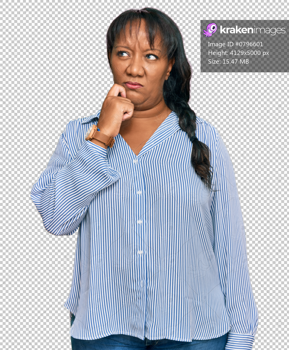 Hispanic middle age woman wearing casual clothes serious face thinking about question with hand on chin, thoughtful about confusing idea