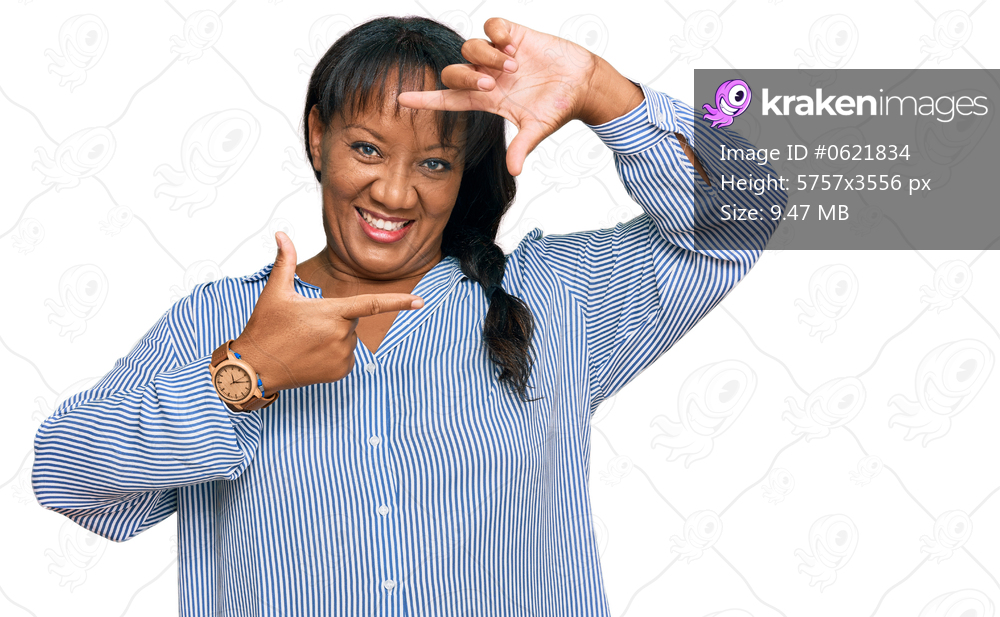 Hispanic middle age woman wearing casual clothes smiling making frame with hands and fingers with happy face. creativity and photography concept.