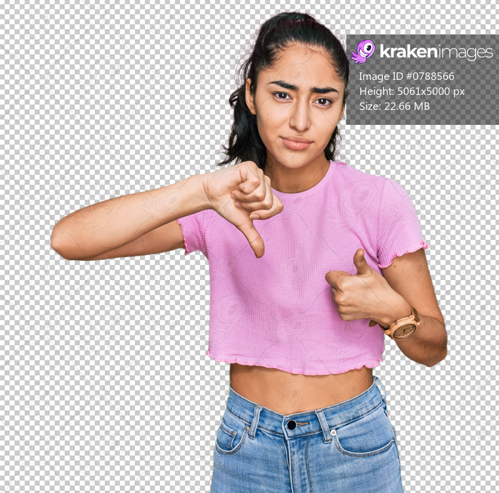 Hispanic teenager girl with dental braces wearing casual clothes doing thumbs up and down, disagreement and agreement expression. crazy conflict