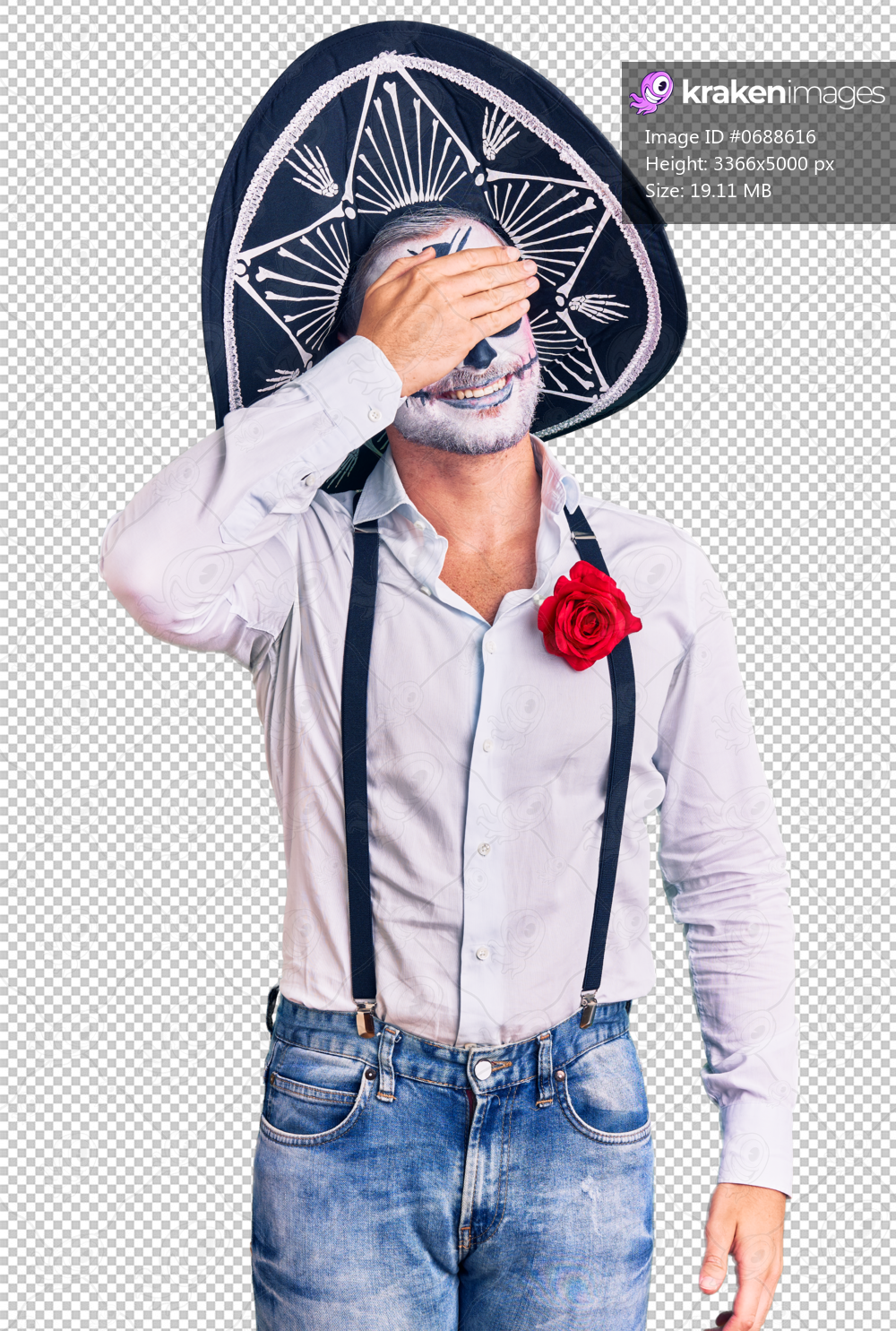 Man wearing day of the dead costume over background smiling and laughing with hand on face covering eyes for surprise. blind concept.