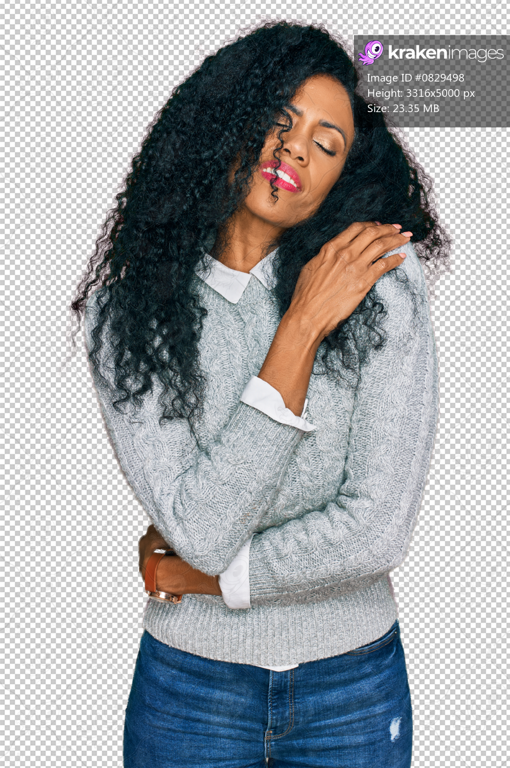 Middle age african american woman wearing casual clothes hugging oneself happy and positive, smiling confident. self love and self care
