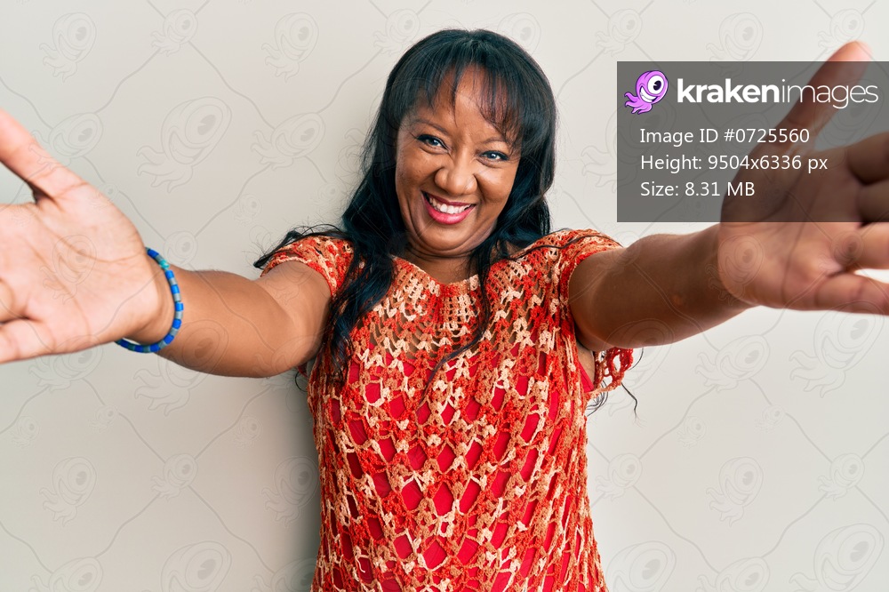 Middle age african american woman wearing casual clothes looking at the camera smiling with open arms for hug. cheerful expression embracing happiness. - Kraken Images