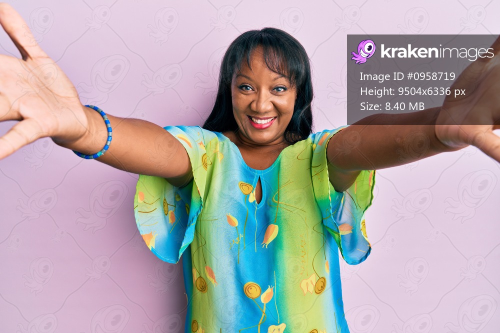 Middle age african american woman wearing casual clothes looking at the camera smiling with open arms for hug. cheerful expression embracing happiness. - Kraken Images