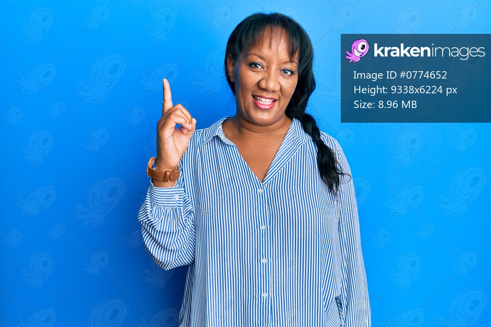 Middle age african american woman wearing casual clothes smiling with an idea or question pointing finger up with happy face, number one