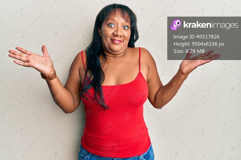 Middle age african american woman wearing casual style with sleeveless shirt clueless and confused with open arms, no idea and doubtful face.