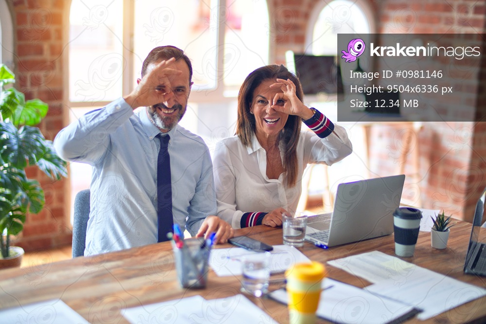 Middle age beautiful business workers working together using laptop at the office doing ok gesture with hand smiling, eye looking through fingers with happy face. - Kraken Images