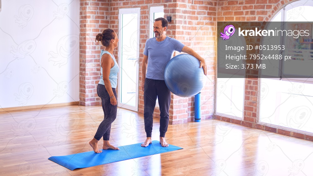 Middle age beautiful sporty couple smiling happy. Standing with smile on face highing five at gym