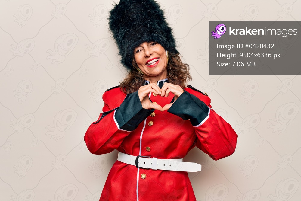 Middle age beautiful wales guard woman wearing traditional uniform over white background smiling in love doing heart symbol shape with hands. Romantic concept. - Kraken Images