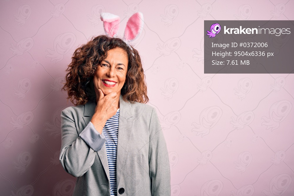Middle age beautiful woman wearing bunny ears standing over isolated pink background looking confident at the camera smiling with crossed arms and hand raised on chin. Thinking positive. - Kraken Images