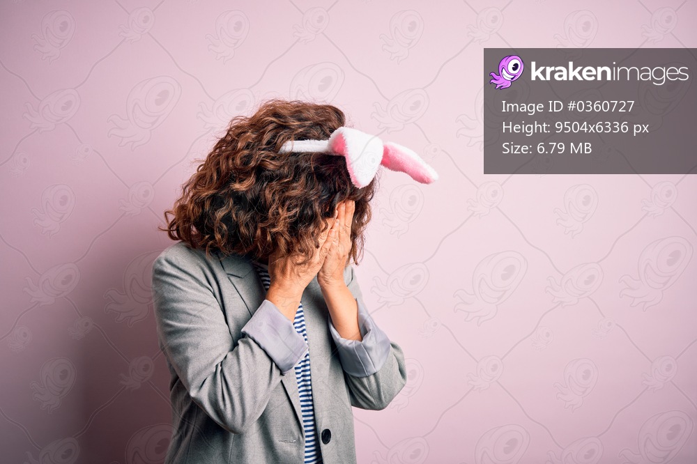 Middle age beautiful woman wearing bunny ears standing over isolated pink background with sad expression covering face with hands while crying. Depression concept. - Kraken Images
