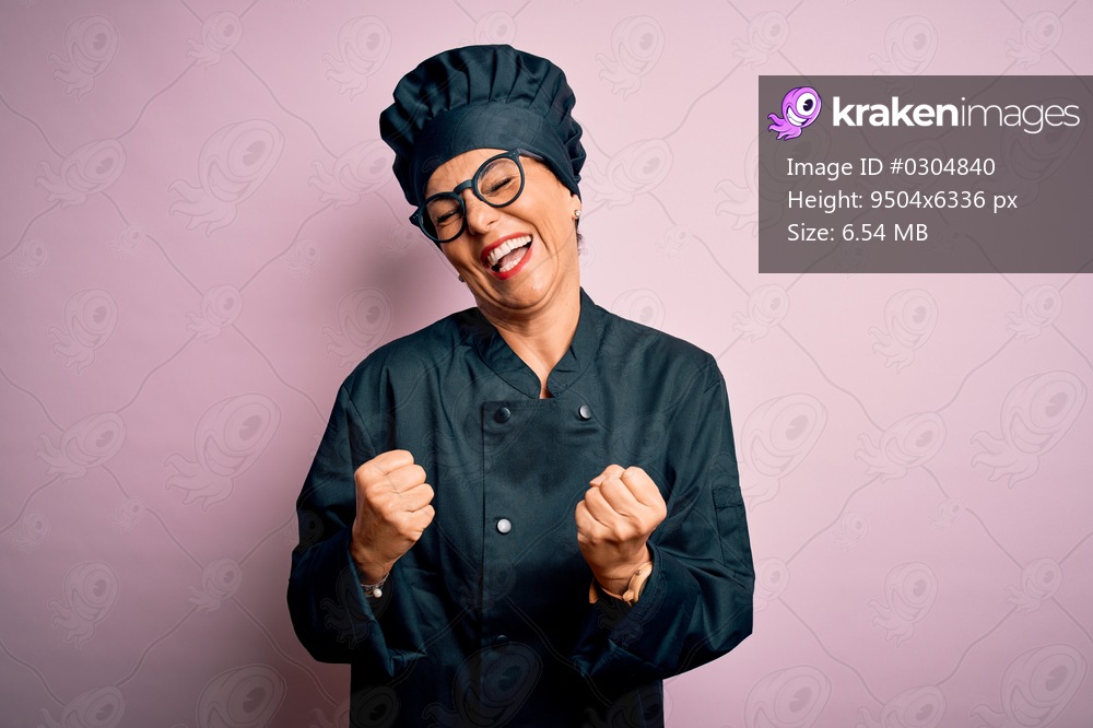 Middle age brunette chef woman wearing cooker uniform and hat over isolated pink background celebrating surprised and amazed for success with arms raised and eyes closed. Winner concept. - Kraken Images