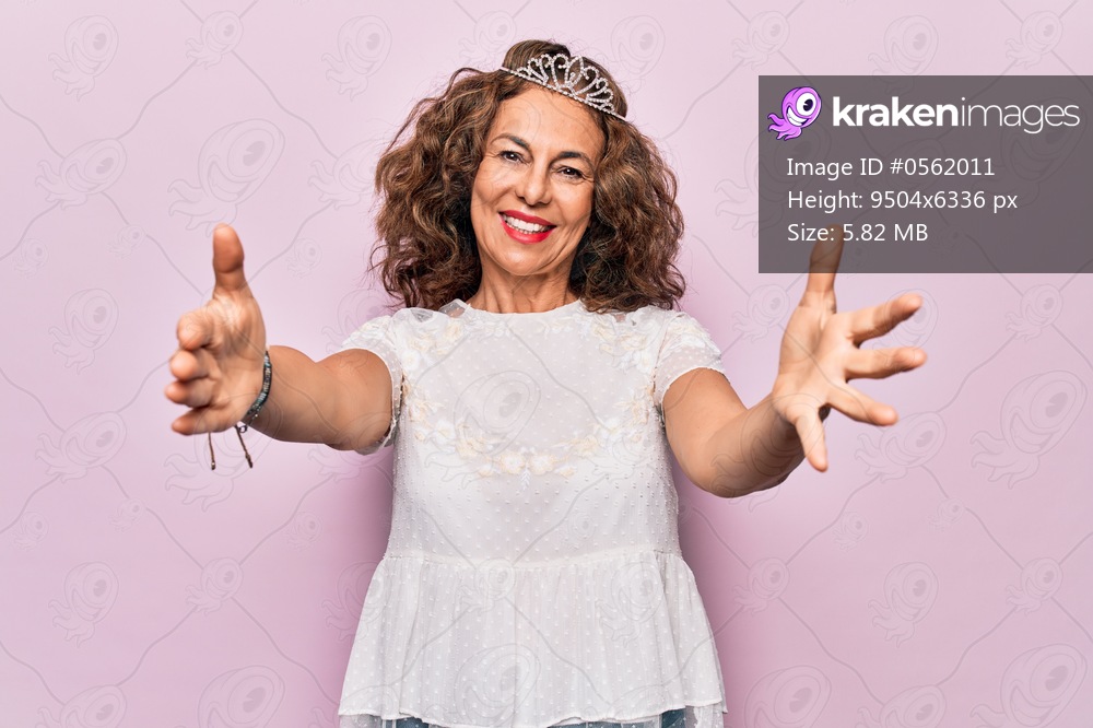 Middle age brunette woman wearing cute princess crown tiara over pink background looking at the camera smiling with open arms for hug. Cheerful expression embracing happiness. - Kraken Images