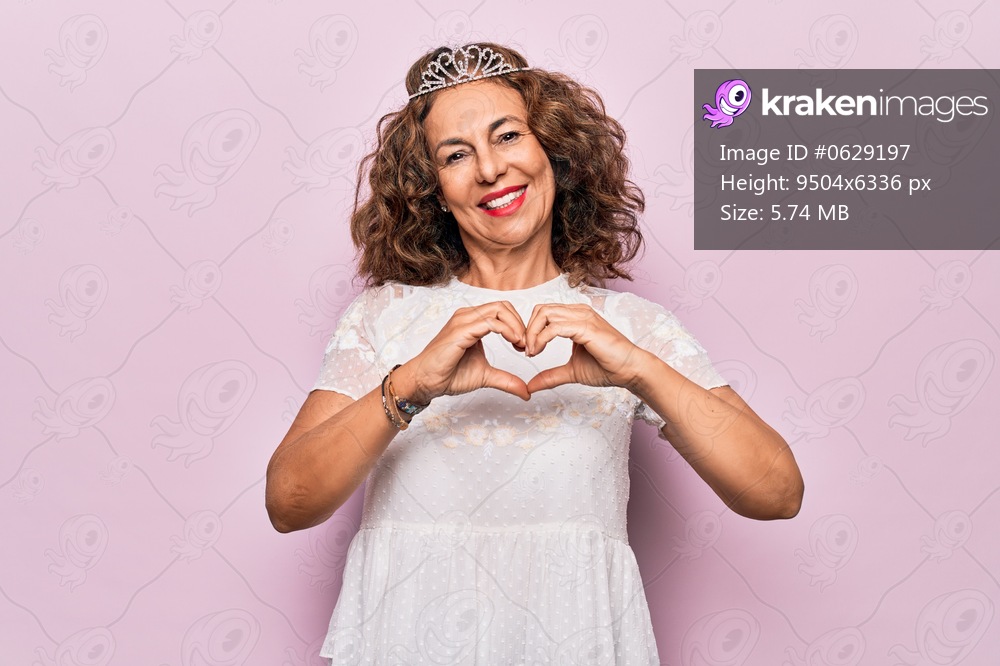 Middle age brunette woman wearing cute princess crown tiara over pink background smiling in love doing heart symbol shape with hands. Romantic concept. - Kraken Images