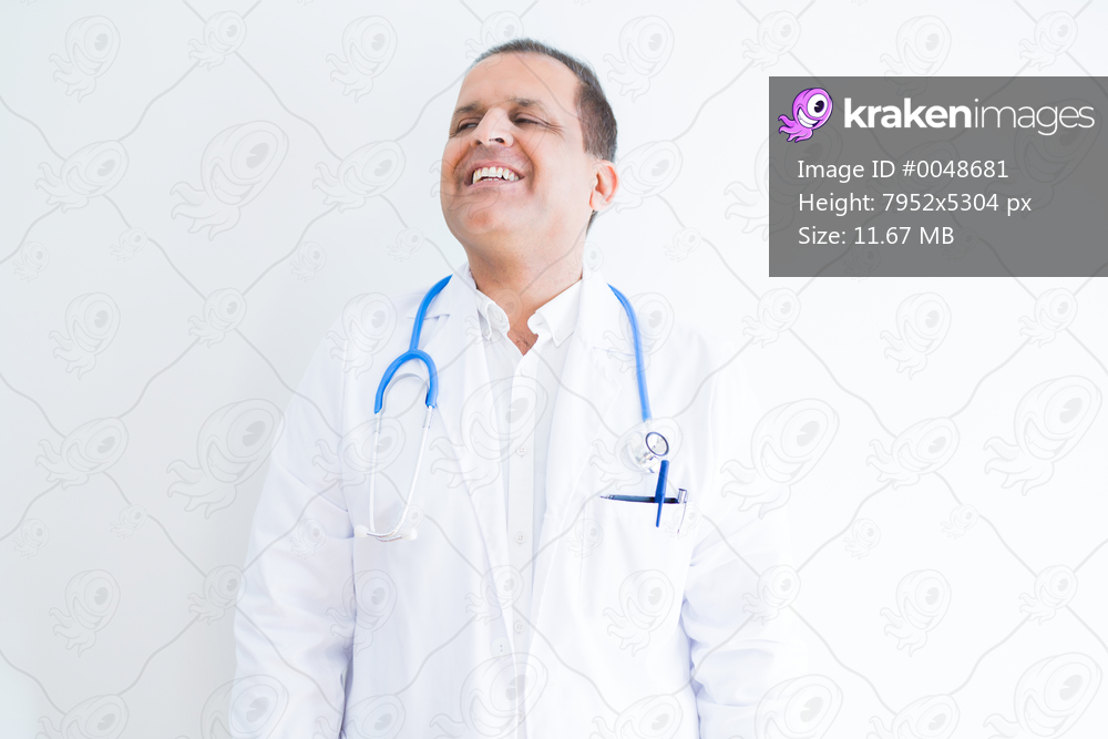 Middle age doctor man wearing stethoscope and medical coat over white background smiling looking side and staring away thinking.