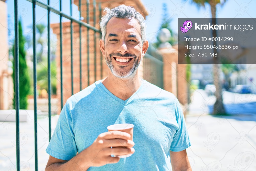 Middle age grey-haired man drinking take away coffee walking at street of city.