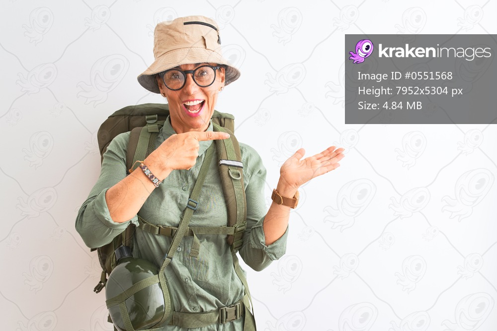 Middle age hiker woman wearing backpack canteen hat glasses over isolated white background amazed and smiling to the camera while presenting with hand and pointing with finger. - Kraken Images